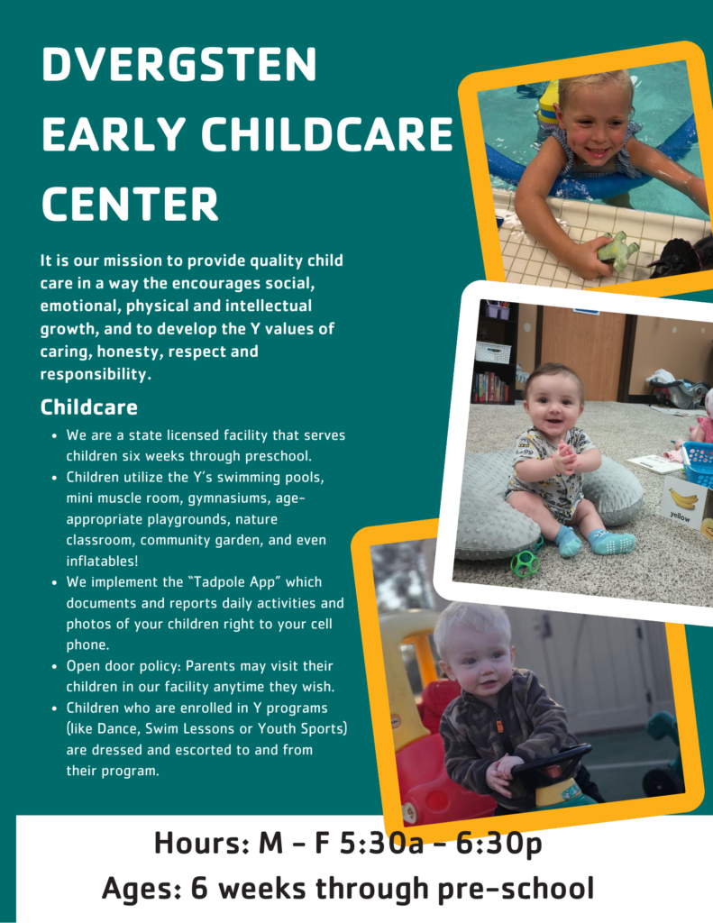Dvergsten Early Childcare Center accepts children 6 weeks to 5 years. Our Infant/Toddler program accepts children 6 weeks to 36 months. Toilet-trained children ages 3 to 5 years who have not yet attended Kindergarten are accepted in our 3, 4 and 5 year old Childcare program.
